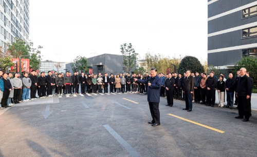 11月28日至12月2日,中共中央总书记、国家主席、中央军委主席习近平在上海考察。这是11月29日下午,习近平在闵行区新时代城市建设者管理者之家,向社区居民挥手致意。新华社记者 申宏 摄
