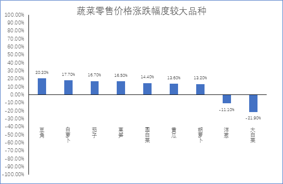 一、蔬菜市场价格趋涨 上周,根据商务部生活必需品市场监测系统平台数据显示,重点监测的30种蔬菜“19涨6平5跌”,整体零售均价环比上周上涨7%,蔬菜市场价格趋涨。其中,豆角、白萝卜、茄子等7个品种涨幅超过10%;洋葱和大白菜2个品种价格跌幅超过10%;生菜、土豆、莲藕、山药、豆芽、青椒6个品种价格环比持平。
