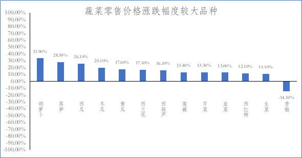 一、蔬菜市场价格上行 上周,根据商务部生活必需品市场监测系统平台数据显示,重点监测的30种蔬菜“23涨5跌2平”,蔬菜零售均价环比上周上涨7%,蔬菜市场价格上行。其中,胡萝卜、莴笋、冬瓜、黄瓜等12个品种涨幅超过10%;青椒1个品种跌幅超过10%;土豆和生姜2个品种价格环比基本持平。