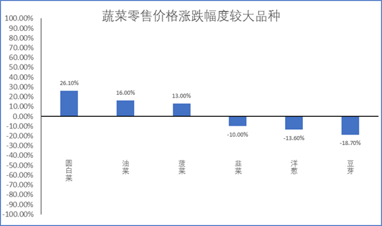 一、蔬菜市场价格运行相对平稳 上周,根据商务部生活必需品市场监测系统平台数据显示,重点监测的30种蔬菜“11涨9平10跌”,整体零售均价环比上周上涨0.6%,蔬菜市场价格整体运行相对平稳。其中, 圆白菜、油菜、菠菜3个品种涨幅超过10%;韭菜、洋葱、豆芽3个品种价格跌幅超过10%;土豆、生姜、胡萝卜、莲藕等9个品种价格环比持平。 二、水果市场价格涨跌幅度不大 上周,商务部内贸监测平台重点监测的8种水果整体均价环比下跌0.5%。其中, 苹果、香蕉、西瓜3个品种价格环比上涨,涨幅分别为6.4%、5.8%、3.7%;葡萄和柑橘2个品种价格环比下跌,跌幅分别为5%和6.5%;梨、菠萝、芒果3个品种价格持平。整体上涨跌幅度不大。 三、肉价持平,蛋价上涨 上周,监测数据显示白条猪肉批发均价为21元/公斤,环比持平。鸡蛋批发均价为8元/公斤,环比上涨11.1%。 |