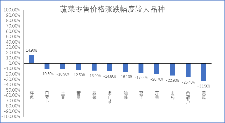一、蔬菜市场下行趋势明显 上周,根据商务部生活必需品市场监测系统平台数据显示,重点监测的30种蔬菜“4涨5平21跌”,整体零售均价环比上周下跌7.6%。其中,仅有洋葱1个品种涨幅超过10%; 白萝卜、土豆、苦瓜、韭菜等11个品种价格跌幅超过10%;西兰花、胡萝卜、莴笋、冬瓜、南瓜5个品种价格环比持平。