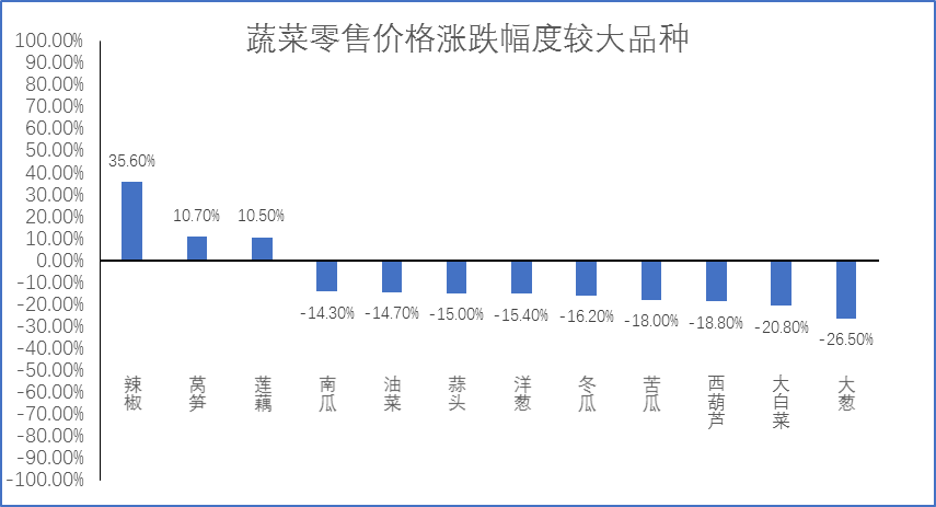 一、蔬菜市场价格运行平稳 上周,根据商务部生活必需品市场监测系统平台数据显示,重点监测的30种蔬菜“8涨8平14跌”,整体零售均价环比上周下跌2.4%。其中,辣椒、莴笋、莲藕3个品种涨幅超过10%; 南瓜、油菜、蒜头、洋葱、冬瓜、苦瓜、西葫芦、大白菜、大葱9个品种价格跌幅超过10%。上周,蔬菜市场供应充足,价格运行平稳。